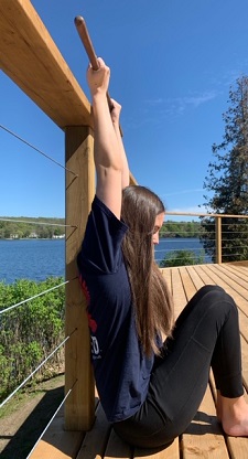 Sit against a wall or flat surface like the photo below. Hold a dowel or stick in an undergrip position with your hands shoulder width apart. Raise your arms up overhead as far as you can without letting your back arch.